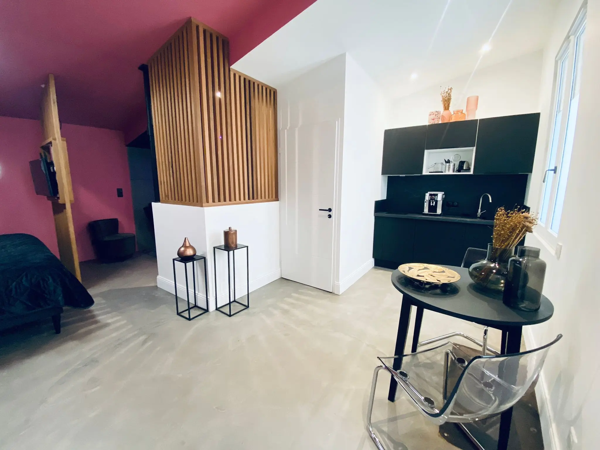 Boiseries cirées ou béton brut et mobilier assorti