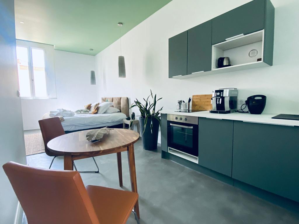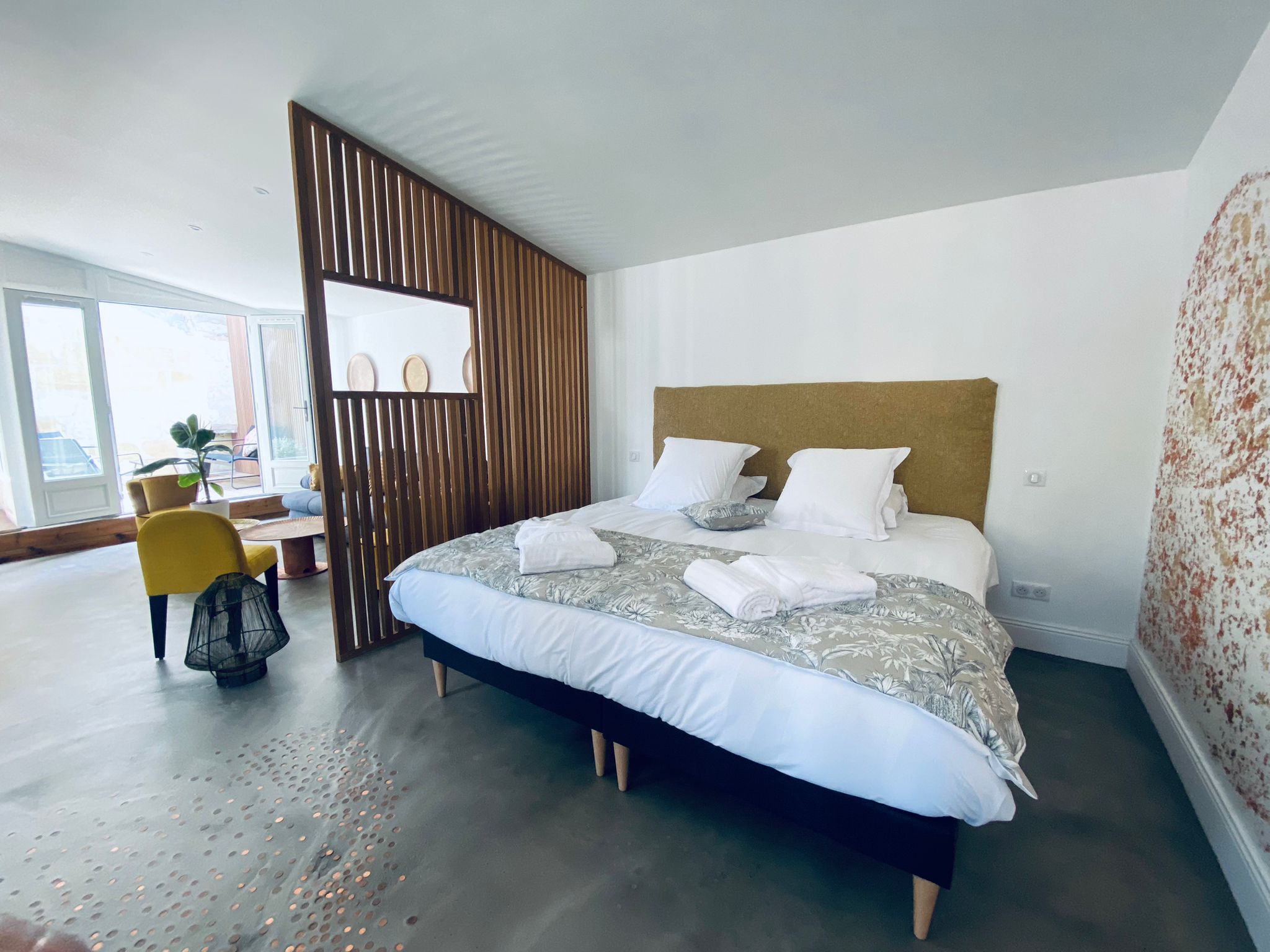 Laissez vous immerger dans des suites décorées avec attention, ou le luxe et le raffinement se retrouvent à tous les niveaux. Décorée avec soin en béton ciré et boiseries, cet appartement très confortable propose un jacuzzi donnant directement sur la terrasse privée